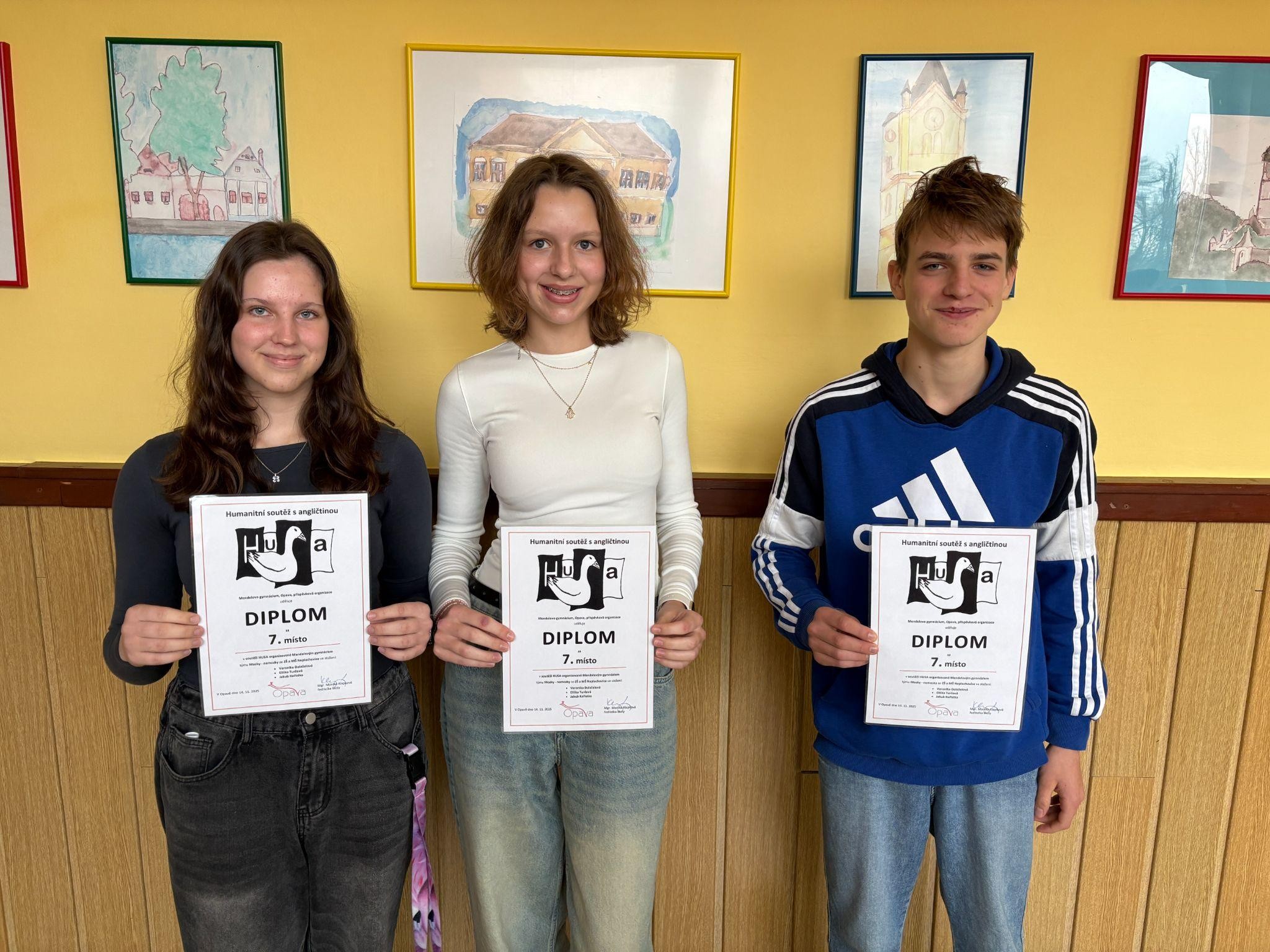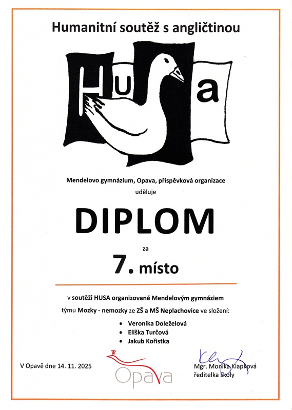 Co vznikne, když spojíte angličtinu, dějepis, češtinu a občanku? Soutěž HUSA! A naši deváťáci u toho na Mendelově gymnáziu v Opavě nemohli chybět. Cíl byl jasný: ukázat, že mají nejen vědomosti, ale že umí táhnout za jeden provaz. Soutěžní klání je zavedlo do školních lavic, ale i mezi exponáty Slezského zemského muzea, kde plnili záludné úkoly. A jak si v obrovské konkurenci 40 týmů vedly naše barvy? Tým s ryze českým názvem Vepřo, knedlo, zelo ve složení Antonín Volný, Karolína Lutzká a Teodora Marethová se nenechal zahanbit a zakotvil na 25. místě. Ještě větší radost nám udělal tým Mozky – Nemozky. Jakub Kořistka, Veronika Doleželová a Eliška Turčová dokázali, že jejich název je jen ironie, protože svými „mozky“ se probojovali až do TOP 10 a odvážejí si parádní 7. místo! Akce nebyla jen o bodech, ale i o zábavě a nových zkušenostech. Všem účastníkům děkujeme za perfektní reprezentaci školy. Ukázali jste, že umíte své znalosti prodat i v praxi!
